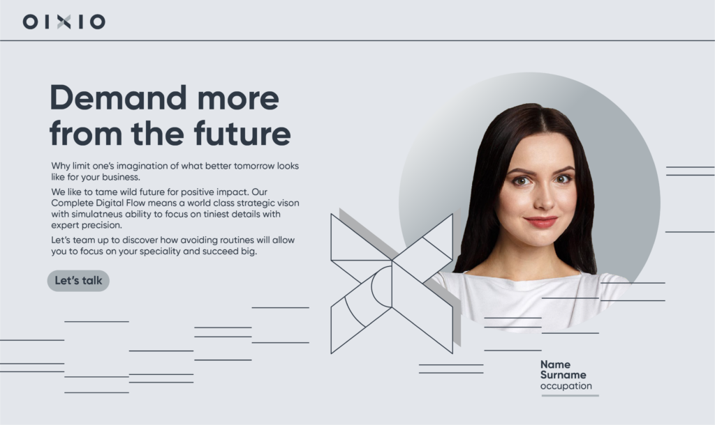An example of incorporating staff member image with illustrations within the context of the layout that establishes the OIXIO branding language, both visually and in terms of messaging.